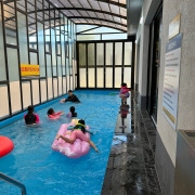 아주 넓은 거실이에요.바닥이 에폭시 바닥이라 그런지 바닥보다 깨끗하게 유지되는 것 같아.거실 바로 옆에 한눈에 보이는 온수 수영장.폴딩도어라서 자유롭게 이동하실 수 있어요.